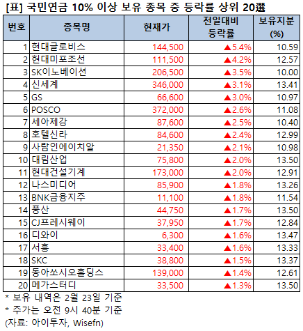 이 외에 현대미포조선(전일 대비 +4.2%), SK이노베이션(+3.5%), 신세계(+3.1%) 등의 종목이 등락률 상위에 랭크됐다. 한편 같은 시각 코스피 지수는 전일 대비 0.2% 오른 2456.48을, 코스닥 지수는 0.8% 오른 881.75를 기록했다.